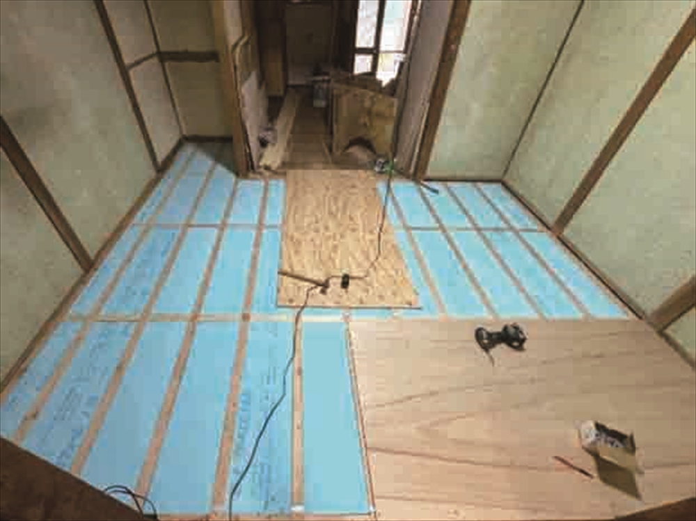 床組をやり替えする際、根太間に断熱材(青色部分)を敷設したケース