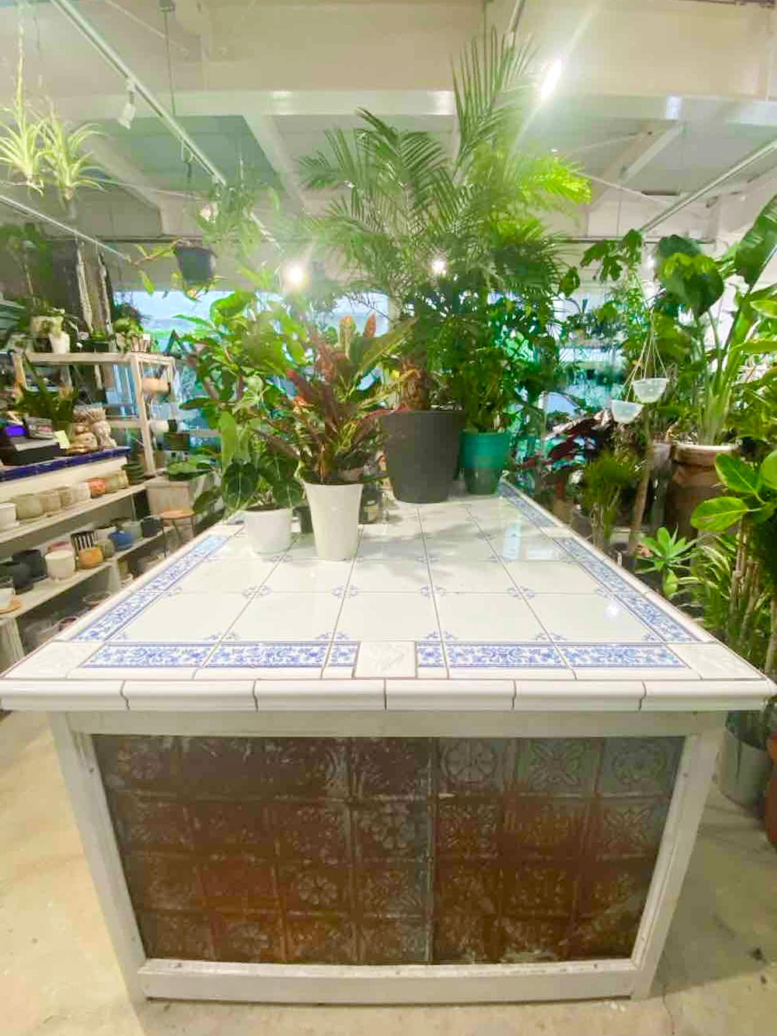 タイルを貼った作業台は、植物のお手入れや土作業にとても便利で、しかも見た目も華やか。お店の雰囲気にもぴったり合っていて、とても素敵な仕上がりになりました。