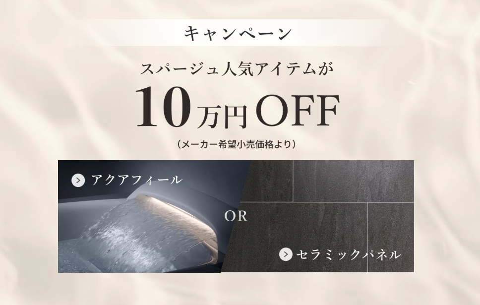 肩湯や腰湯など、上質なリラックス体験が味わえるスタイリッシュなシステムバス 「スパージュ」 を対象とした特別キャンペーンを開催しています。