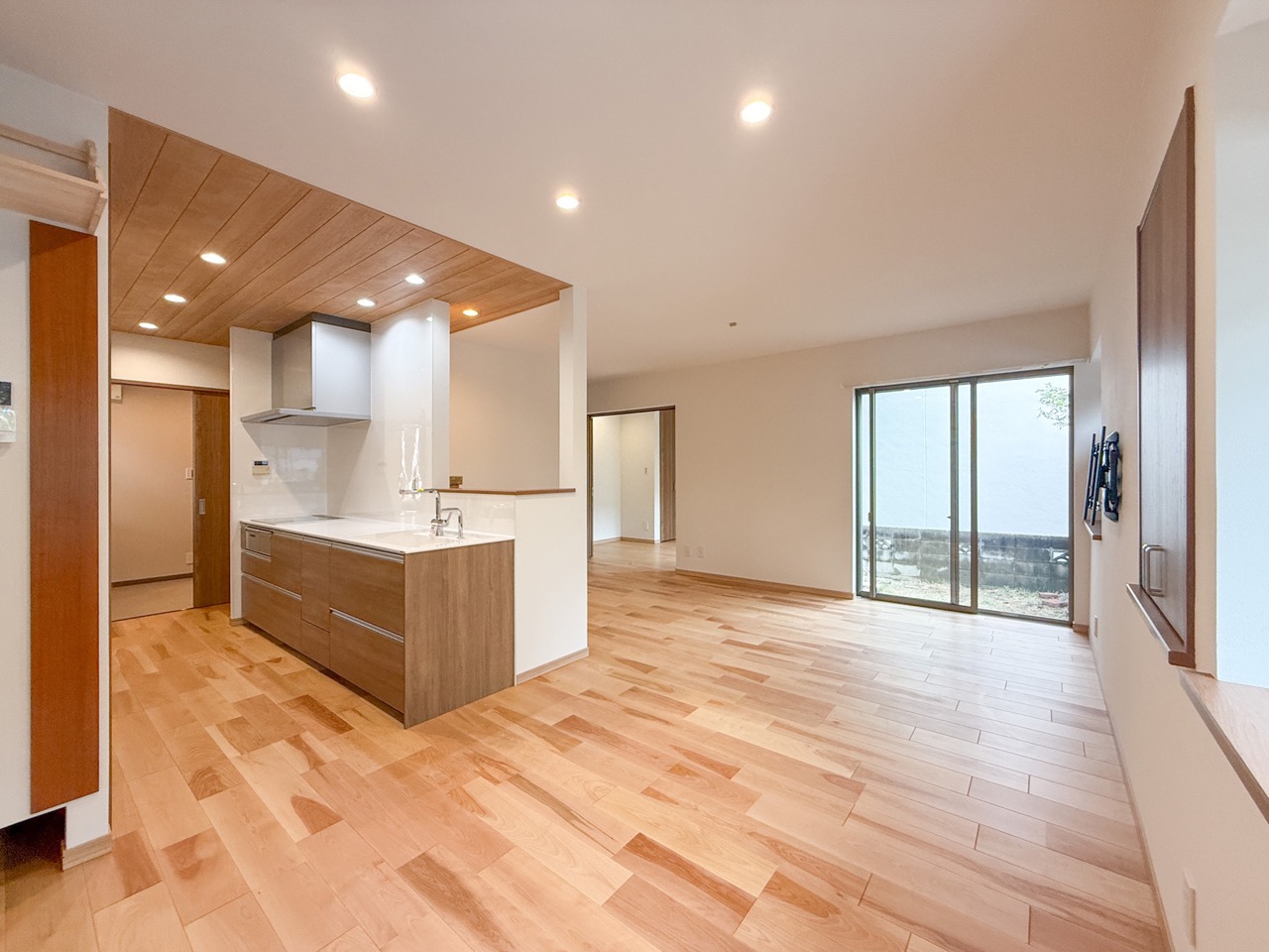 天井に木質材を化粧貼りし、温かみのある上質な空間を演出したこと。