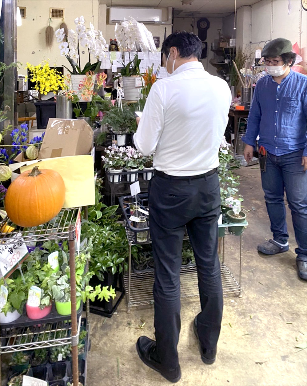 一生懸命にお花を吟味して、オリジナルブーケを店主さんにオーダーしている瀬戸専務。