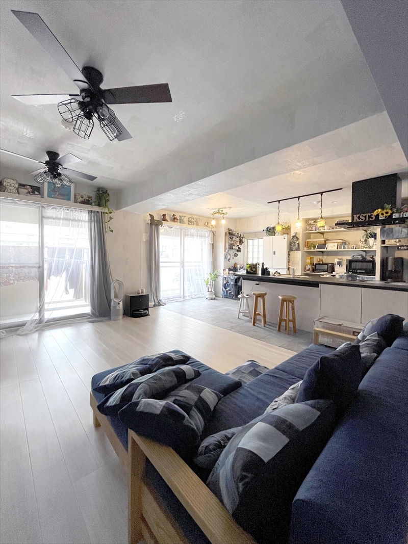 このアイランドキッチン以外にも、M様こだわりのタイルやデニムが随所に散りばめられた、とっても素敵なマンションリノベーション。
