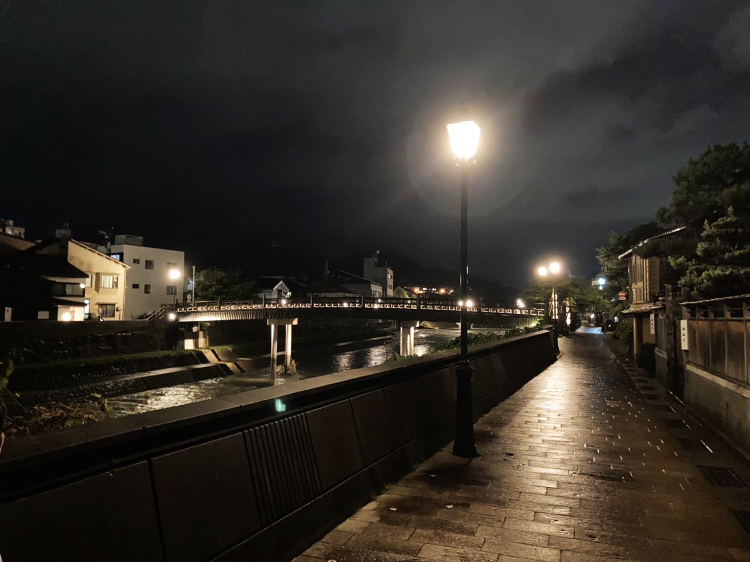 大雨の後、夜のとばりが下りた「ひがし茶屋町」を散策しましたが、ほとんど人がいなくて、やわらかな街灯に浮かび上がる街並みがいい雰囲気でした。