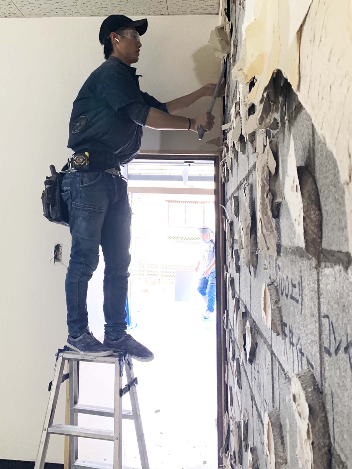 若手大工の仲道君、ベテラン松本大工さんで、壁の解体からスタート。