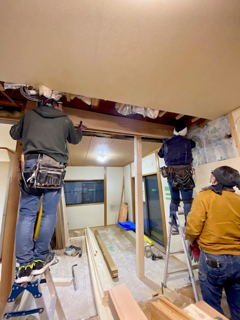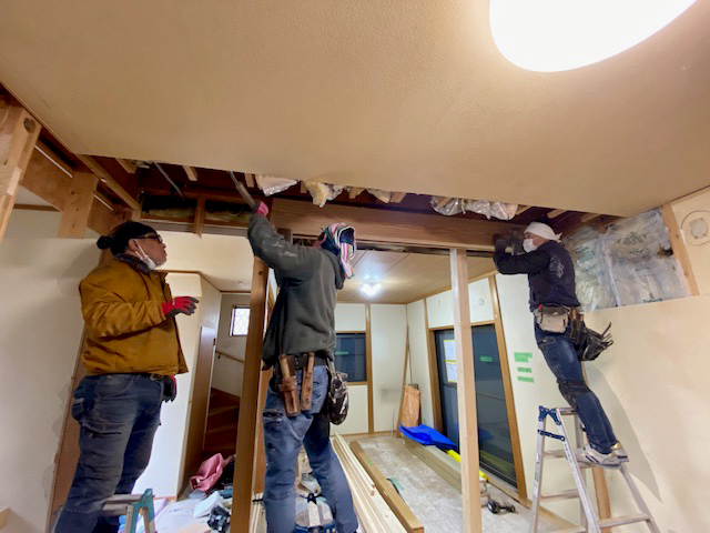 こちらは間取り変更に伴って柱を抜いたため、耐震性を保つための梁補強工事をしているところ。