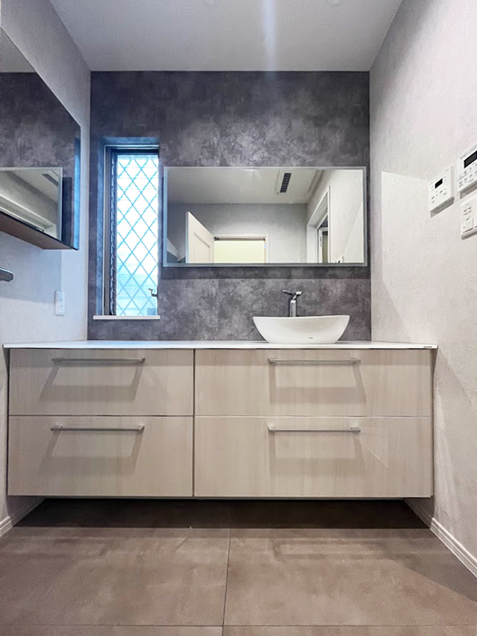 クリスタルカウンターも素敵ですが、お施主様支給の一面鏡がとにかくおしゃれ!
