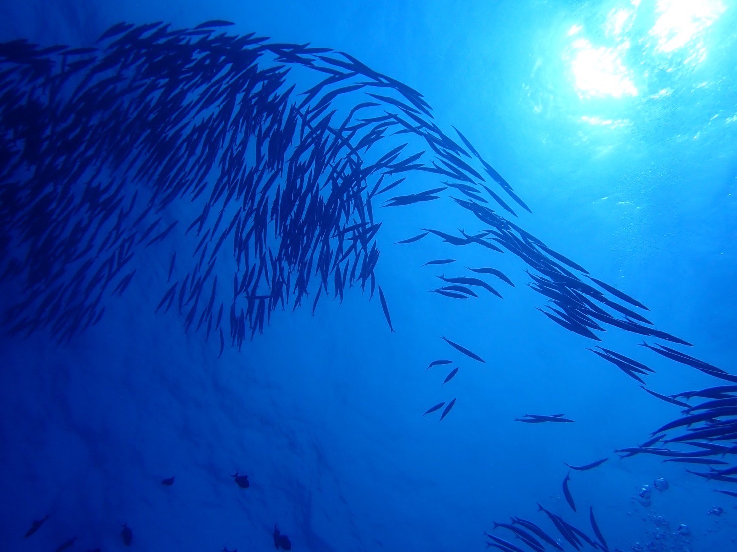 ギンガメアジの大群やロウニンアジ、イソマグロ、などなどとてつもない種類・量のお魚天国です。