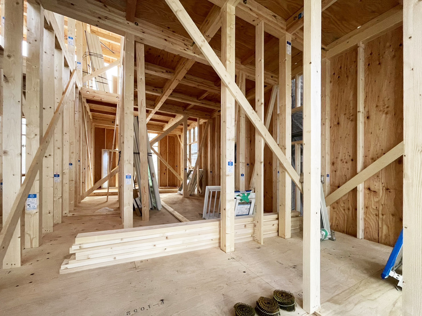 新築現場では建前が終わり、内部の木工事の行程へと進んでいます。