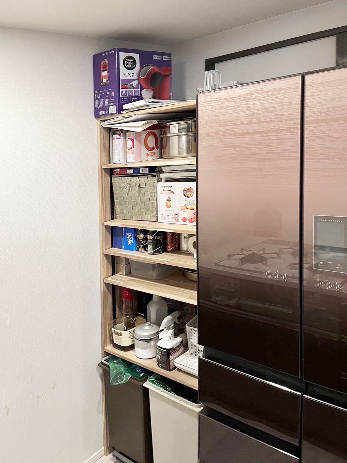朝から息子と冷蔵庫横のスペースを便利な収納スペースにリフォーム!