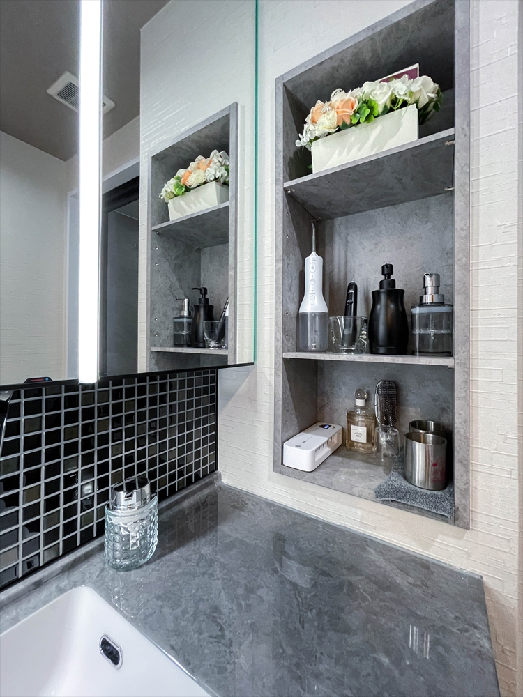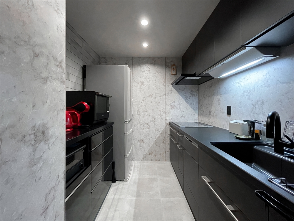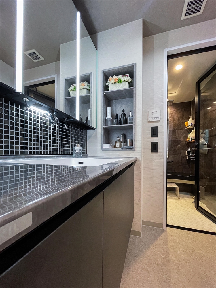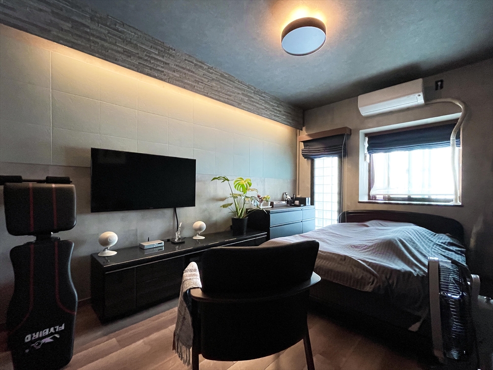 寝室はそれぞれ思い思いにコーディネート。洗面台とキッチンは、以前リフォームした浴室に合わせてブラック系をチョイス。私達夫婦が大好きなタイルを散りばめたり、ニッチ収納もグレードアップしたり、こだわりをいっぱい詰め込みました。