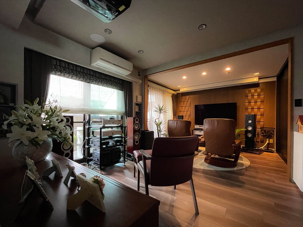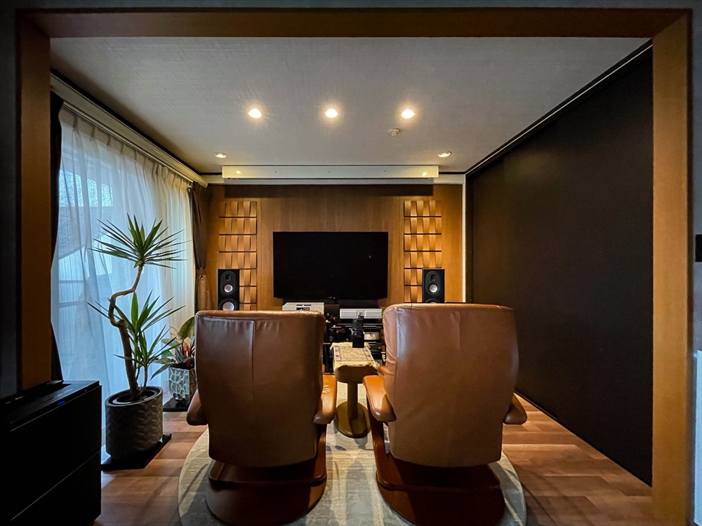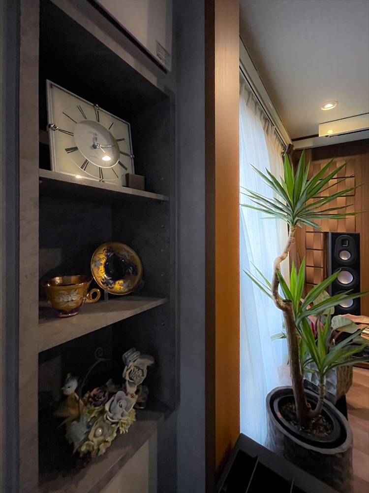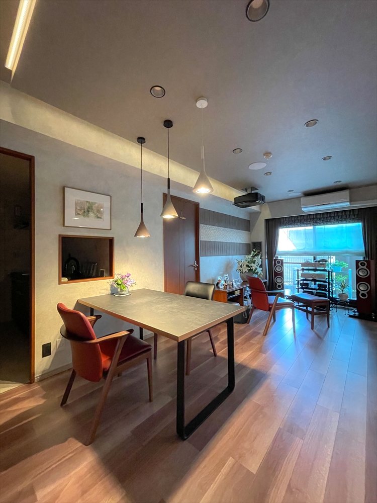 オーディオ関係の配線を天井に隠ぺい後、調光・調色タイプの造作照明やダウンライトをあしらい、曲や気分によって灯りを演出できる空間になりました。
