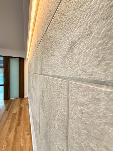 また、主人がこだわったエコカラットに造作照明を組み合わせた壁面は本当に素敵で、眺めるたびに心が満たされます。