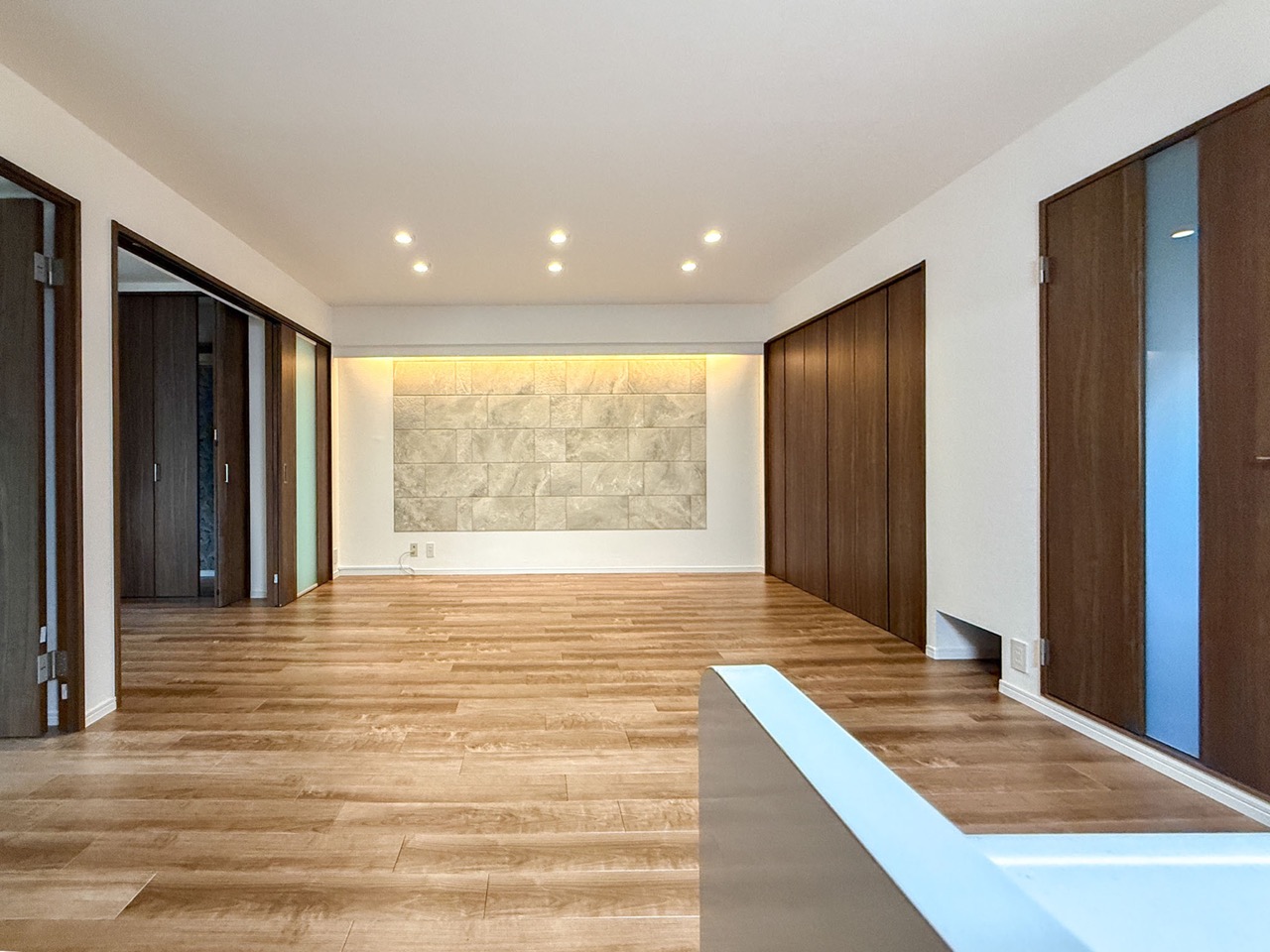 既存の和室二間は、リビングと緩やかにつながる開放的な洋室へ一新。収納は使い勝手を考慮して細やかにカスタマイズしました。さらに住まいの中に点在する“余白”を収納として活かす工夫を随所に取り入れています。