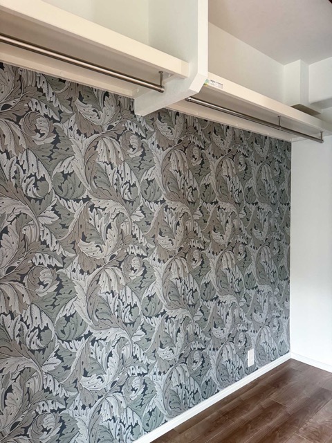 最後まで悩んだウィリアム・モリスの壁紙は、寝室ではなくあえてクローゼットの中に。扉を開けるたびに好きな柄が目に飛び込んでくる今の仕上がりを見て、この選択で間違いなかったと満足しています。